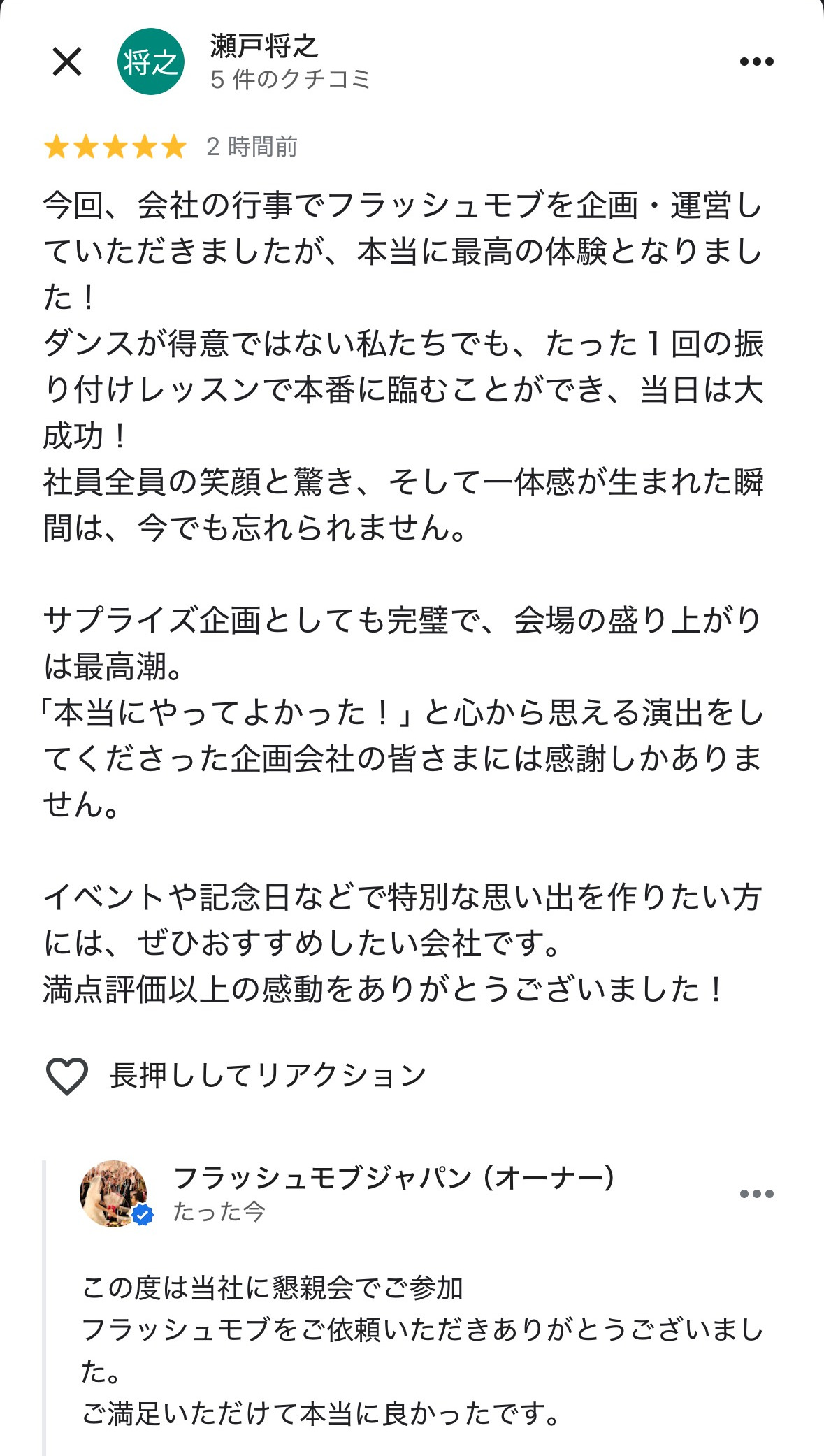この度は、素敵なフラッシュモブをありがとうございました。おかげさまですごい盛り上がりで、我々もとても楽しかったです